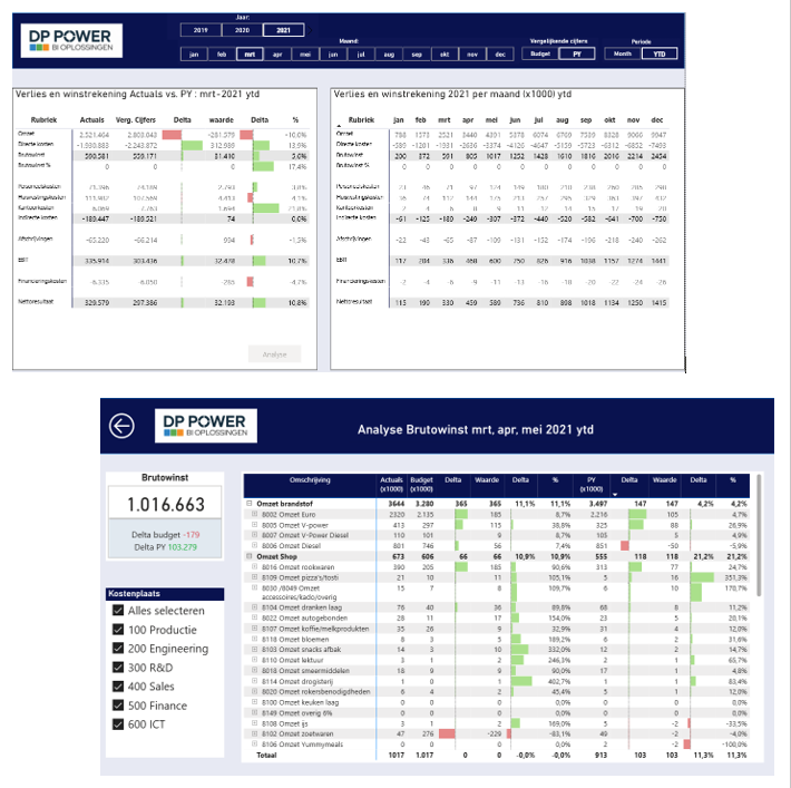 Het verlies en winstrekening dashboard biedt direct inzicht in de cijfers voor een geselecteerde periode en alle maanden in het betreffende jaar. Je kan zelf kiezen of je de actuele cijfers wilt vergelijken met budget, forecast of vorig jaar.